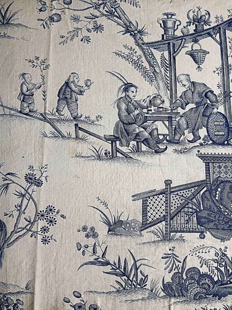 Panneau de toile de Jouy représentant de magnifiques scènes de la vie en Asie (probablement en Chine).